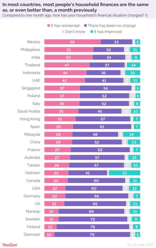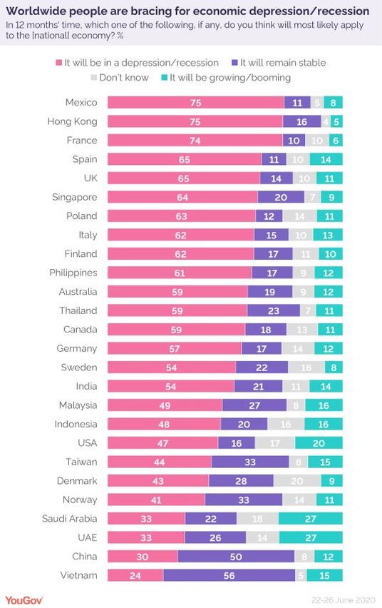 Przez osiem tygodni w ramach badania YouGov, śledzącego ożywienie gospodarcze, pytano ludzi w 26 krajach i regionach o ich sytuację gospodarczą i perspektywy. Recesja lub depresja to najbardziej oczekiwane skutki koronawirusa na całym świecie. Pesymizm gospodarczy jest największy w Meksyku i Hongkongu, gdzie 75 proc. ludzi uważa, że gospodarka będzie w depresji lub recesji za 12 miesięcy. Ta liczba w Hongkongu wyraźnie kontrastuje z opiniami z pozostałej części Chin, gdzie tak samo mówi tylko 30 proc. ankietowanych - to drugi najniższy wynik dla wszystkich rynków objętych badaniem. Podobnie ponuro oceniają swoje perspektywy gospodarcze Francuzi - sądzi tak 74 proc. badanych. Najmniej pesymistycznym krajem jest Wietnam, gdzie tylko 24 proc. spodziewa się recesji lub depresji. Większość Wietnamczyków (56 proc.) spodziewa się, że gospodarka pozostanie stabilna przez następny rok.
