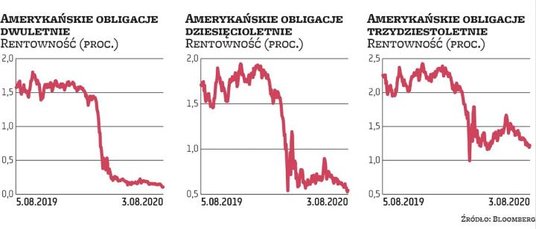 Rentowność amerykańskich obligacji dziesięcioletnich lekko rosła podczas poniedziałkowej sesji, sięgając po południu 0,55 proc. Wciąż jednak była zbliżona do najniższego poziomu od marca. Co prawda do marcowego dołka (0,31 proc.) wciąż nieco brakuje, ale analitycy Deutsche Banku wskazują, że rentowność amerykańskich obligacji stała się w tym roku najniższa, odkąd w 1786 r. zaczęto zbierać dane na ten temat.