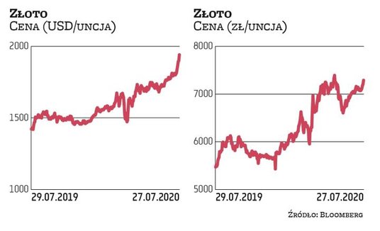 Za uncję złota płacono w poniedziałek prawie 1945 USD – najwięcej w historii. Cena kruszcu pobiła rekord z września 2011 r. Od początku roku wzrosła już o 28 proc., przez ostatnie 12 miesięcy zyskała 36 proc., a przez ostatnie pięć lat 77 proc. Wielu analityków twierdzi, że cena kruszcu może pójść jeszcze wyżej i w średnim terminie przebić poziom 2000 USD za uncję.