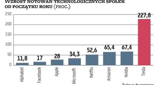 Inwestorzy na Wall Street na potęgę kupują akcje spółek technologicznych, czego efektem jest wzrost notowań Nasdaqa o 52 proc., licząc od marcowego dołka do 10433 pkt. Wyceny Tesli czy Amazona przebijają kolejne bariery psychologiczne i są najwyżej w historii.
