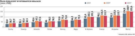 OECD przypomina, że do zbliżonego wzrostu zadłużenia doszło podczas kryzysu finansowego z lat 2008–2009. Wtedy jednak zajęło to dwa lata. Uwzględniając w rachunkach także 2021 r., gdy długi rządów mogą wciąż rosnąć, pandemia doprowadzi do bezprecedensowego w czasach pokoju pogorszenia stanu finansów publicznych. Zjawisko to nie ominie Polski. Sam rząd w sporządzonej pod koniec kwietnia tzw. aktualizacji programu konwergencji – dokumencie, który każdy kraj członkowski UE co roku musi przedstawić Komisji Europejskiej – założył, że zadłużenie sektora finansów publicznych zwiększy się w br. do 55,2 proc. PKB z 46 proc. w ub.r. Jeszcze większego skoku zobowiązań polskiego rządu spodziewa się KE. Z jej prognoz opublikowanych na początku maja wynika, że dług publiczny Polski sięgnie w tym roku 58,5 proc. PKB, aby w 2021 r. minimalnie zmaleć – do 58,3 proc. PKB.