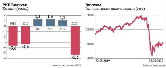 Prawdopodobnie Brazylia już jest pogrążona w recesji. Mediana prognoz analityków zebranych przez agencję Bloomberga mówi, że jej PKB spadnie w II kwartale o 6,5 proc. kw./kw., a najbardziej pesymistyczne prognozy mówią o spadku o 11,5 proc. Międzynarodowy Fundusz Walutowy spodziewa się, że w 2020 r. gospodarka Brazylii skurczy się o 5,3 proc. Brazylijski indeks giełdowy Bovespa stracił od początku roku ponad 30 proc., co plasuje go w gronie najgorszych w tym okresie indeksów świata. Narodowa waluta, czyli real, osłabła natomiast od początku stycznia o blisko 30 proc. wobec dolara – bardziej niż jakakolwiek inna waluta na świecie. Choć inwestorzy w zeszłym roku bardzo optymistycznie podchodzili do perspektyw gospodarczych Brazylii i wolnorynkowych reform wdrażanych przez administrację Bolsonaro (świadczył o tym optymizmie wzrost indeksu Bovespa aż o 31,6 proc.), to w tym roku wystawili Brazylii czerwoną kartkę. Czynnikiem, który o tym przesądził, była właśnie koronawirusowa katastrofa.