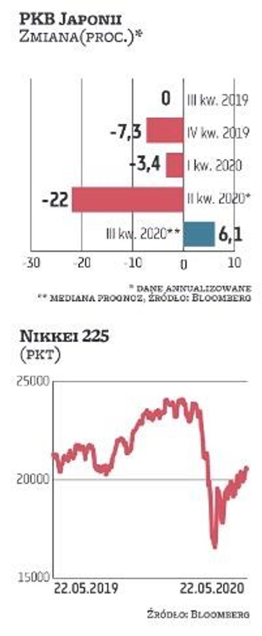 Japonia już jest pogrążona w recesji, ale, co ciekawe, zaczęła się one jeszcze przed silniejszym uderzeniem fali epidemii. W IV kwartale 2019 r. PKB spadł o 7,3 proc. (to dane annualizowane, czyli zmiana jest obliczana w stosunku do wcześniejszego kwartału i przeliczana na tempo roczne), na co duży wpływ miała podwyżka podatku od sprzedaży, silny tajfun oraz słaba koniunktura w handlu międzynarodowym. Spadek PKB w I kwartale tego roku był już mniejszy – wyniósł 3,4 proc. Mediana prognoz analityków zebranych przez agencję Bloomberga zakłada, że spadek w II kwartale wyniesie aż 22 proc. Prognozy wahają się od minus 4 proc. (Societe Generale) do minus 35 proc. (JPMorgan Chase). Bank Japonii szacuje, że spadek PKB za cały 2020 r. wyniesie 4 proc., a Międzynarodowy Fundusz Walutowy – że będzie to 5,2 proc. Byłoby to zatem nieco mniej niż w kryzysowym 2009 r. (spadek o 5,4 proc.) i byłby to wynik lepszy niż w przypadku wielu gospodarek rozwiniętych.