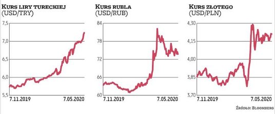 Lira turecka stała się w czwartek rekordowo słaba wobec dolara. Kurs chwilowo skoczył nawet do 7,49 za dolara, by później zejść w okolice 7,25. Od końca 2019 r. turecka waluta straciła 18 proc. wobec amerykańskiej. Turcja znów znalazła się, obok m.in. Rosji, Meksyku, RPA i Brazylii, w gronie krajów uznawanych za słabe ogniwa rynków wschodzących.