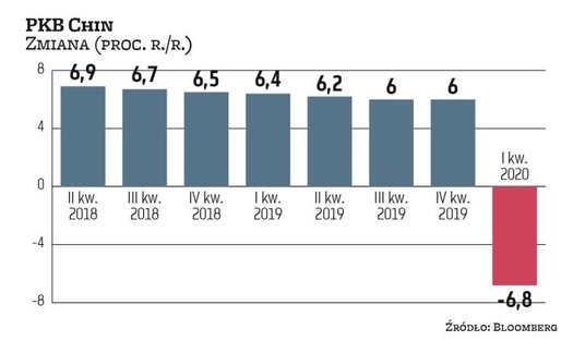 PKB Chin zmniejszył się w pierwszym kwartale o 6,8 proc. r./r. To prawdopodobnie pierwszy jego spadek od 1976 roku, czyli od roku śmierci Mao Zedonga. Średnia prognoz analityków ankietowanych przez Agencję Reutera mówiła o skurczeniu się gospodarki o 6,5 proc. r./r. Prognozy wahały się od wzrostu o 4 proc. do spadku o 29 proc. Chiny to pierwszy kraj publikujący dane mówiące, jak bardzo pandemia koronawirusa wpłynęła na ich kwartalny PKB.