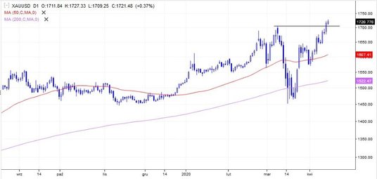 W tym kontekście wtorkowe wyjście notowań kruszcu na wieloletnie maksima wydaje się całkiem uzasadnione. Kurs przebił poprzedni szczyt hossy wyznaczony 9 marca (1703 USD) i wyznaczył nowy 1727 USD. Licząc od dołka z ubiegłego miesiąca kruszec podrożał już o 19 proc., a wyznaczając nowe maksimum dał techniczny sygnał do kontynuacji hossy, która trwa od sierpnia 2018 r. - Nawet gdy sytuacja rynkowa ulegnie poprawie, czy to tymczasowo, czy nie, a inwestorzy wrócą, uważamy, że złoto także będzie absorbować napływ kapitału obok innych klas aktywów. Inwestorzy zdają sobie sprawę z utrzymującego się ryzyka, a aktywa takie jak złoto, zapewniają ciągłe zabezpieczenie przed złym scenariuszem – uważa Louney.