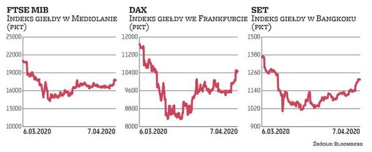 Na giełdach w Azji i Europie wciąż było czuć we wtorek optymizm. Japoński Nikkei 225 zyskał w ciągu sesji ponad 2 proc., tajski SET skoczył o 6,7 proc., a indyjski Sensex aż o 8,9 proc. Niektóre europejskie indeksy zyskiwały we wtorek po południu po ponad 4 proc. Wśród nich znalazły się: WIG20, niemiecki DAX i włoski FTSE MIB. Te trzy indeksy, a także m.in. francuski CAC 40 i paneuropejski Euro Stoxx 50 zyskały już od marcowych dołków po ponad 20 proc., teoretycznie więc wyszły już z rynku niedźwiedzia (choć wciąż bardzo daleko im do przedkryzysowych szczytów).Sesja w USA zaczęła się od zwyżek, a Dow Jones Industrial rósł 3,8 proc. Ale dzień wcześniej wzrósł on aż o 7,7 proc. Inwestorzy pozytywnie reagowali na zapowiedzi poluzowania kwarantanny w kilku krajach Europy. Rynek nabrał przekonania, że z koronawirusem można wygrać.