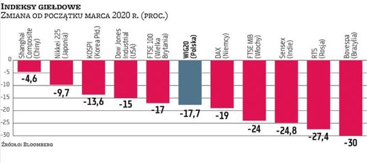 WIG20 z blisko 17 proc. spadkiem wypadł nieco lepiej od niemieckiego indeksu DAX, ale gorzej od amerykańskiego Dow Jones Industrial, który stracił około 14 proc. Silnej przecenie na globalnych rynkach towarzyszyła bardzo duża zmienność. Dow Jones dochodził na początku miesiąca do poziomu 27 tys. pkt (w lutym zbliżał się do 30 tys.), by 23 marca sięgnąć 18,2 tys. pkt i później odbić się w okolice 22 tys. pkt.