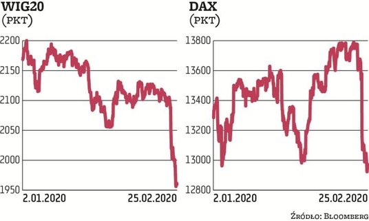 – Inwestorzy powinni poważnie pomyśleć o kupowaniu na dołkach – stwierdził Larry Kudlow, doradca ekonomiczny prezydenta USA. We wtorek jednak nie było widać wśród inwestorów wielkiej chęci do kupowania. Choć południowokoreański indeks KOSPI zyskał w ciągu sesji 1,2 proc., to japoński Nikkei 225 spadł o 3,3 proc. (w poniedziałek giełda tokijska była zamknięta, więc można to uznać za późną reakcję na rozprzestrzenianie się koronawirusa). Niemal wszystkie giełdy w Europie doświadczały spadków, które były jednak bardziej umiarkowane niż w poniedziałek. Niemiecki DAX spadał po południu o 0,4 proc., a włoski FTSE MIB zniżkował o 0,5 proc. Polski WIG20 tracił na początku sesji 2,6 proc., ale późnym popołudniem spadek wyhamował do 2,1 proc. O ile dzień wcześniej spadł on poniżej poziomu 2000 pkt, o tyle we wtorek znalazł się najniżej od stycznia 2017 r.