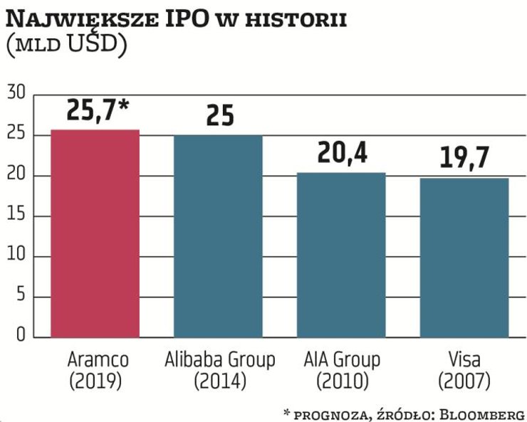 To miała być oferta publiczna wszech czasów. IPO saudyjskiego, państwowego koncernu naftowego Aramco miało być warte nawet 100 mld USD i wycenić spółkę na ponad 2 bln. Taką wizję snuto kilkanaście miesięcy temu. Potencjalna data tej oferty była jednak co jakiś czas przesuwana. Po tym gdy wielu ludzi zaczęło wątpić w to czy w tym roku do niego dojdzie, saudyjski regulator na początku listopada wydał zgodę na jej przeprowadzenie. Mowa była wówczas o sprzedaniu akcji wartych 40–45 mld USD. Wartość całej spółki wyceniono na „rozczarowujące" 1,5 bln USD. Dwa tygodnie później określono wycenę Aramco w przedziale 1,6–1,71 bln USD. To wciąż bardzo dużo – to suma podobna do nominalnego PKB Rosji. Okazało się jednak, że na rynek trafi jedynie 1,5 proc. akcji tej spółki. W górnym przedziale cenowym zostanie zebrane z rynku 25,65 mld USD. W dolnym 24 mld USD, czyli mniej niż podczas oferty Alibaba Group z 2014 r. (25 mld USD), będącej jak dotąd największym IPO w historii. Okazało się też, że akcje Aramco nie będą sprzedawane bezpośrednio w USA, Kanadzie, Australii czy Japonii. Oferta będzie skupiona na lokalnych inwestorach. Co się stało, że tak mocno zmniejszyła się ranga oferty, która miała być absolutnym rekordem na rynku?