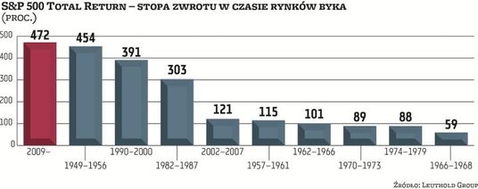 Uwzględniający dywidendy indeks S&P 500 Total Return zyskał od dołka z marca 2009 r. już 472 proc. To sprawia, że obecny rynek byka nie tylko jest najdłuższy w historii, ale też przyniósł największą stopę zwrotu. Poprzedni rekord należał do hossy z lat 1949–1956.