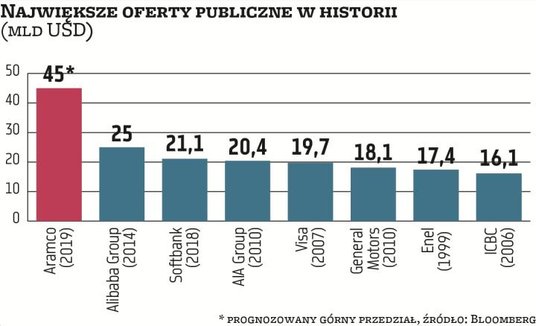 Nawet jeśli zostanie zrealizowany najbardziej ostrożny scenariusz, mówiący o pozyskaniu z rynku „tylko" 40 mld USD, to oferta Aramco będzie największym IPO w historii. Dotychczasowy rekord to 25 mld USD pozyskanych w 2014 r. przez Alibaba Group, chińskiego giganta sprzedaży internetowej.