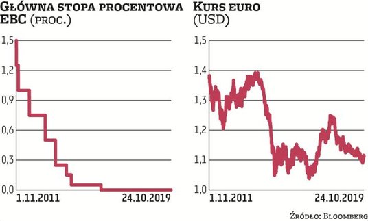 Mario Draghi to pierwszy w historii szef EBC, który nigdy nie podniósł stóp procentowych. Jego rządy to też czas osłabienia euro wobec dolara.
