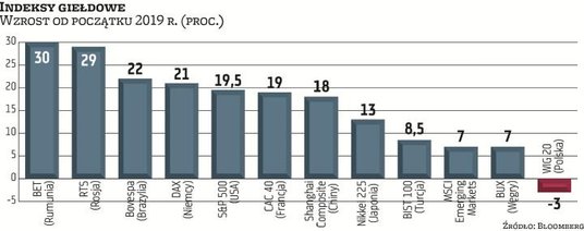 Tegoroczne zwyżki na wielu rynkach i tak okazały się już zadziwiająco solidne. Np. S&P 500 zyskał blisko 20 proc., czyli niewiele mniej niż np. brazylijski indeks Bovespa. Stało się tak pomimo niepewności dotyczącej amerykańsko-chińskiej wojny handlowej i obaw przed ewentualną recesją. Niemiecki DAX wzrósł w tym roku o 21 proc., choć przecież Niemcom recesja grozi obecnie o wiele bardziej niż USA. Chiński Shanghai Composite zyskał 18 proc. pomimo spowolnienia gospodarczego. Prognozy analityków co do dalszych zwyżek w nadchodzących miesiącach są więc ostrożne. Np. mediana przewidywań dla indeksu S&P 500 mówi, że na koniec roku będzie on sięgał 3000 pkt.
