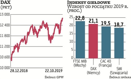 Frankfurcka giełda sprawia wrażenie, jakby nie odczuwała skutków spowolnienia gospodarczego w Niemczech. Indeks DAX zyskał od początku roku już ponad 21 proc. i znalazł się na podobnym poziomie jak w lipcu 2018 r. Zbliżył się do 12 800 pkt. Do szczytu z końcówki 2017 r. wciąż mu trochę jednak brakuje – wynosił wtedy około 13 500 pkt.
