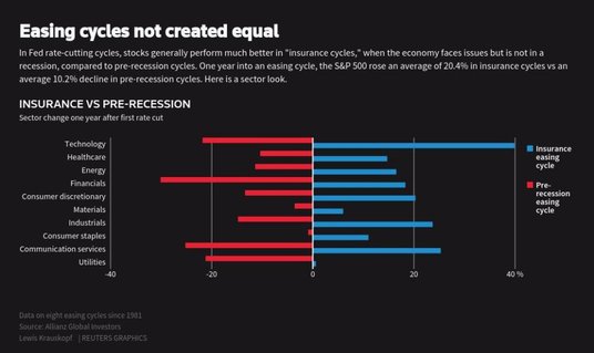 Podczas cięć w cyklach o charakterze ubezpieczeniowym najlepiej radziły sobie spółki z branży technologicznej, których notowania rosły średnio o 40 proc. Na drugim miejscu były spółki świadczące usługi komunikacyjne, a na trzecim spółki przemysłowe. Natomiast w przypadku cykli rozpoczynanych na krótko przed recesją najmocniej spadały odpowiednio notowania spółek: finansowych, komunikacyjnych i technologicznych.