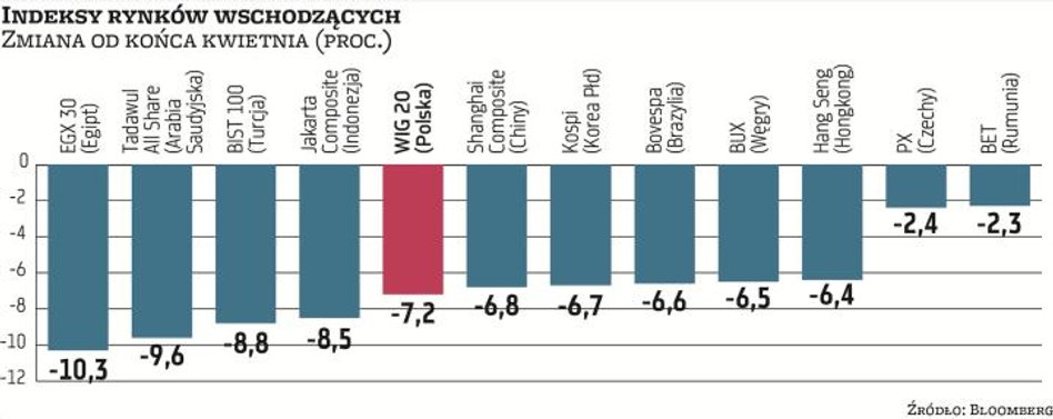 Maj okazuje się jak na razie fatalnym miesiącem dla większości rynków wchodzących. Niektóre indeksy w ciągu prawie trzech tygodni straciły po około 10 proc. (np. egipski EG 30 czy ADX, główny indeks giełdy w Abu Zabi). Pod presją znalazły się indeksy azjatyckie. Shanghai Composite spadł od końca kwietnia o 6,4 proc. Według danych Instytutu Finansów Międzynarodowych (IIF) od 5 maja z chińskich giełd odpłynęło 5,3 mld USD. Kapitał uciekał więc z tego rynku w podobnym tempie jak podczas krachu z 2015 r. Inwestorzy odwracali się też jednak od giełd Europy Środkowo-Wschodniej czy Ameryki Łacińskiej. WIG20 spadł o 7,2 proc., węgierski BUX o 6,4 proc., a brazylijski Bovespa zniżkował o 6,6 proc. Dane IIF mówią, że od 5 maja z rynków wschodzących, poza Chinami, odpłynęło 7,6 mld USD. Ten exodus był napędzany m.in. obawami przed zaostrzeniem amerykańsko-chińskiej wojny handlowej.