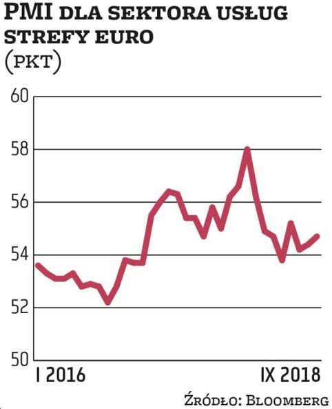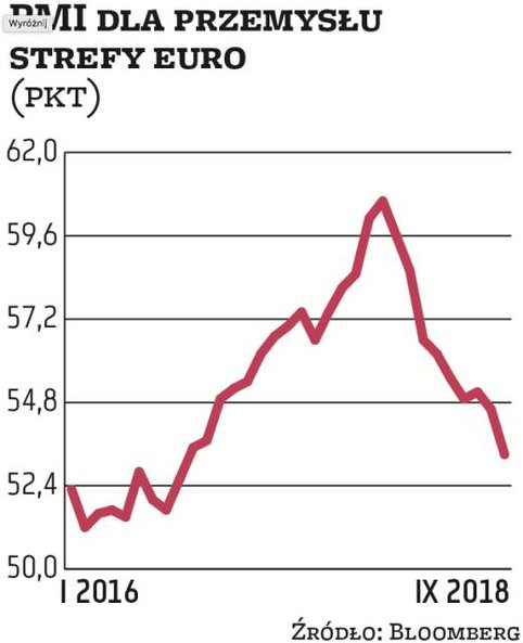 Śpieszmy się korzystać z dobrej koniunktury gospodarczej w strefie euro, bo szybko potrafi przemijać. W zeszłym roku Euroland przechodził solidne ożywienie, które dotarło nawet na jego peryferia. PKB strefy wzrósł w 2017 r. o 2,4 proc., gdy amerykański zwiększył się wówczas o 2,2 proc. W tym roku sytuacja się jednak wyraźnie odwróciła. Najnowsze prognozy Międzynarodowego Funduszu Walutowego mówią, że PKB strefy euro wzrośnie w tym roku o 2 proc., gdy wzrost gospodarczy w USA (napędzany cięciami podatków przez administrację Trumpa) przyspieszy do 2,9 proc. W przyszłym roku wzrost w USA ma wyhamować do 2,5 proc., a w strefie euro do 1,9 proc. Pogorszenie widać również we wskaźnikach koniunktury. We wrześniu łączny wskaźnik PMI dla przemysłu i sektora usług Eurolandu zniżkował do 54,2 pkt, czyli najniższego poziomu od września 2016 r. Jest on wciąż dosyć wysoko i sugeruje w miarę solidny wzrost gospodarczy (0,5 proc. kw./kw.), ale wyraźnie widać, że okres najszybszej ekspansji gospodarczej w strefie euro jest już za nami. Pod koniec zeszłego roku ten indeks zbliżał się do 59 pkt. „Spowolnienie powinno być kontynuowane również w czwartym kwartale, gdy w ostatnich miesiącach widzieliśmy utratę tempa, jeśli chodzi o produkcję i o nowe zamówienia" – skomentował te dane Chris Williamson, główny ekonomista firmy IHS Markit, przeprowadzającej badania PMI.