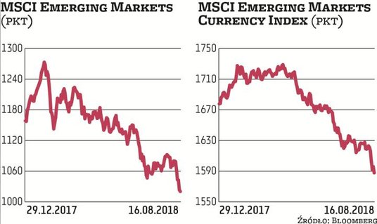 Indeks walut z rynków wschodzących MSCI znalazł się najniżej od maja 2017 r. Przyczyniła się do tego ostra przecena liry tureckiej (spadek o 35 proc. do dolara od początku roku), rubla (spadek o 14 proc.), reala brazylijskiego (spadek o 15 proc.), peso argentyńskiego (spadek o 38 proc.) czy osłabienie juana chińskiego (przecena o 5,6 proc.).