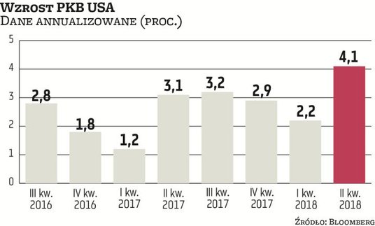 Wzrost gospodarczy w USA przyspieszył w drugim kwartale do 4,1 proc. Był wówczas najwyższy od 2014 r. Dane za pierwszy kwartał zrewidowano w górę z 2 proc. do 2,2 proc. Wstępny odczyt PKB za drugi kwartał był zgodny z oczekiwaniami analityków, ale i tak to bardzo solidny wzrost. To kolejny sygnał pokazujący, że cięcia podatków wdrożone przez administrację Trumpa dały amerykańskiej gospodarce silną stymulację.