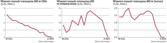 Jeśli rzeczywiście dojdzie do stagflacji, to z jednej strony będą temu winne banki centralne, a z drugiej główni gracze na rynku ropy naftowej. Załamanie gospodarcze w Wenezueli, porozumienie o ograniczeniu produkcji ropy przez kraje OPEC i Rosję, a także powrót amerykańskich sankcji wymierzonych w Iran to czynniki prowadzące do podwyżek cen ropy, czyli mogące napędzać inflację w wielu krajach. Jednocześnie zacieśnianie polityki pieniężnej przez banki centralne może zaszkodzić akcji kredytowej. Część ekonomistów już dostrzega tego oznaki. Wzrost M3, szerokiego wskaźnika podaży pieniądza, wyhamował w USA pierwszym kwartale 2018 r. do 2 proc. Zwykle za optymalne tempo jest uznawane 4–5 proc. W strefie euro wzrost M3 zwolnił w tym czasie do 2,3 proc., czyli do najniższego poziomu od zakończenia kryzysu w strefie euro. Hamowanie tego wskaźnika zwykle jest sygnałem poprzedzającym spowolnienie gospodarcze. W nadchodzących miesiącach może być pod tym względem gorzej. Fed zmniejsza swoją sumę bilansową w tempie 20 mld USD miesięcznie, a we wrześniu tempo to przyspieszy do 50 mld USD miesięcznie. Europejski Bank Centralny ogranicza zaś skup aktywów w ramach programu QE i do końca roku zaprzestanie go. – Będą z pewnością w sporych kłopotach w przyszłym roku – prognozuje Tim Congdon z amerykańskiego Institute of International Monetary Research.