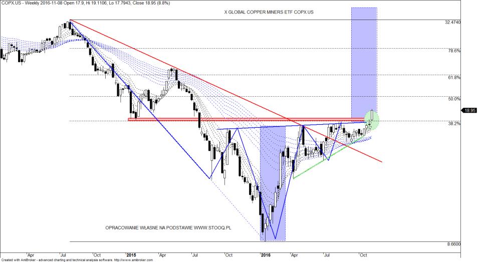 Biorąc pod uwagę postępującą aprecjację cen miedzi oraz wybicie oporów przez COPX.US ETF (instrument obrazujący zachowanie się kluczowych producentów miedzi), spółki z grona Copper Miners zaczęły w ostatnich dniach przełamywać swoje kluczowe podażowe poziomy. HudBay Minerals od początku miesiąca zwiększa swoją rynkową wycenę, a skoro odbywa się to na rosnących obrotach, to należałoby sądzić, iż papier przygotowuje się do wdrapania na nowe tegoroczne maksima. Tego typu zabieg oznaczałby aktywację długoterminowej struktury z potencjałem ruchu w okolice ekstremów 2014-2015. Na korzyść wzrostowego scenariusza przemawia także lokalny układ wskaźników impetu, układ średnich EMA oraz zachowanie dziennej dwusetki. SL ląduje na 3.55USD close i do tej wysokości outlook na spółkę jest optymistyczny.