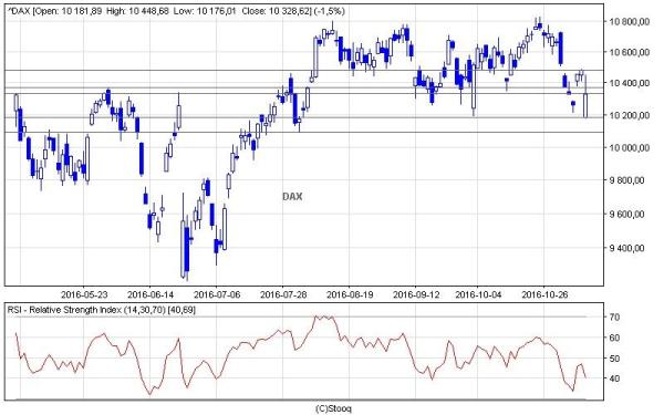 Dużą luką spadkową rozpoczął dzisiejszą sesję również Niemiecki DAX. Indeks, podobnie jak hiszpański IBEX35, wystartował z poziomu ważnego wsparcia w strefie 10 200 – 10 100 pkt. Co istotne – już w ciągu dwóch pierwszych godzin handlu DAX domknął lukę z otwarcia, rosnąc w porywach do 10 448 pkt. O godz. 13.15 notowania indeksy spadały 1,2 proc. do 10 357 pkt, co nie jest dramatycznym wynikiem, zwłaszcza w obliczu wydarzeń zza oceanu.