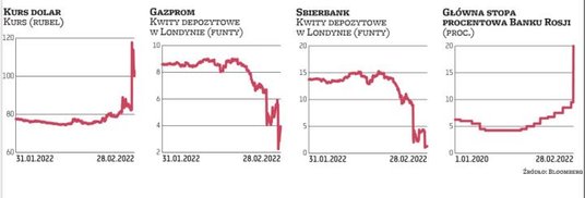 Nad ranem w poniedziałek na azjatyckich rynkach offshore za 1 dolara płacono nawet 119 rubli. Rosyjska waluta straciła więc prawie 30 proc. w porównaniu z piątkowym wieczorem. Później kurs wrócił w okolice 103 rubli za dolara. Od początku roku rubel stracił już 24 proc. wobec amerykańskiej waluty, co czyni go w tym okresie najgorszą walutą świata. Bank Rosji, by powstrzymać jego załamanie, podniósł w poniedziałek rano główną stopę procentową z 9,5 proc. do 20 proc., a także zakazał inwestorom zagranicznym sprzedaży rosyjskich akcji. Giełda w Moskwie nie ruszyła i nie wiadomo, czy będzie działać we wtorek. Silnie wyprzedawane były za to kwity depozytowe rosyjskich spółek notowane w Londynie. Sbierbank tracił w ciągu dnia 70 proc., a Gazprom spadał nawet o 44 proc. Wojna przyniosła więc Rosji finansowe załamanie. Czy może doprowadzić ten kraj do bankructwa?