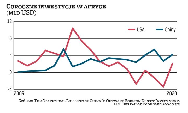 Oprócz zwiększonej wymiany handlowej Chińczycy coraz chętniej inwestują na Czarnym Lądzie. W 2019 r. całkowita wartość chińskiego FDI w Afryce wyniosła 44 mld USD, co uplasowało Chińczyków na czwartej pozycji. Nie udało się dogonić Amerykanów, którzy w Afryce zainwestowali już ok. 78 mld USD. Nie ma także porównania z Europą: kraje Unii oraz Wielka Brytania pozostają niekwestionowanymi liderami inwestycji w Afryce, a łączna wartość ich FDI wyniosła w 2020 r. aż 222 mld USD. W odróżnieniu od Europejczyków i Amerykanów, chińskie pieniądze przeznaczane są chętniej na infrastrukturę. Od 2011 r. Chiny są największym zagranicznym inwestorem w tym sektorze, odpowiadając za ok. 40 proc. wszystkich inwestycji.