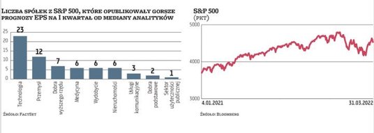 Z danych FactSet wynika, że w I kwartale 2022 r. szacowana stopa wzrostu zysków dla spółek z S&P 500 wynosi 4,8 proc. Jeśli rzeczywiście tak się stanie, będzie to najgorszy wynik od IV kwartału 2020 r., kiedy zyski wzrosły o 3,8 proc. Warto zaznaczyć, że w ostatnich miesiącach prognozy te się pogorszyły. Jeszcze pod koniec 2021 r. szacowano, że w I kwartale 2022 r. zyski wzrosną o 5,7 proc. Z kolei wzrost przychodów może sięgnąć w I kwartale 10,7 proc., co byłoby już piątym kwartałem z rzędu, kiedy tempo sprzedaży jest dwucyfrowe.