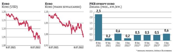 Model wypracowany przez agencję Bloomberg wskazuje, na podstawie notowań opcji, że jest obecnie 60 proc. szans na to, że euro osiągnie parytet z dolarem. Z frankiem szwajcarskim już go osiągnęło i osłabło jeszcze bardziej – w zeszłym tygodniu za 1 euro płacono mniej niż 1 franka. Wygląda na to, że inwestorzy spodziewają się, że Europejski Bank Centralny nie będzie taki jastrzębi, jak jeszcze niedawno przewidywali. Na rynku zaczyna zwyciężać przekonanie, że recesja zmusi EBC do wstrzymania się z podwyżkami stóp procentowych na jesieni lub zimą. Rynek przeszedł więc od obaw przed inflacją do strachu przed recesją.
