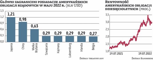 Według danych Departamentu Skarbu USA w maju w chińskich rękach był amerykański dług rządowy wart łącznie 980,8 mld USD, o 23 mld USD mniej niż w kwietniu i o prawie 100 mld USD mniej niż w rok wcześniej. Wartość tego długu w portfelach chińskich inwestorów stała się najniższa od maja 2010 r. Na pierwszym miejscu wśród największych zagranicznych wierzycieli USA wciąż była Japonia. W maju japońscy inwestorzy posiadali amerykańskie obligacje rządowe warte łącznie 1,21 bln USD. Oni również jednak redukowali ich portfele – o 6 mld USD w porównaniu z kwietniem i o 54 mld USD w relacji do maja 2021 r.