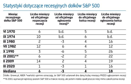 Rzut oka na drugi wykres szybko pozwala sobie uświadomić prostą regułę – kiedy już dochodziło do recesji zgodnie z powszechnie akceptowaną metodologią instytutu NBER (National Bureau of Economic Research), to dno trendu spadkowego na Wall Street NIGDY nie pojawiało się przed rozpoczęciem recesji, lecz dopiero w jej trakcie. Średnio rzecz biorąc, S&P 500 twarde dno „uklepywał” sześć miesięcy po umownym rozpoczęciu kurczenia się amerykańskiej gospodarki. W poszczególnych przypadkach liczba ta wahała się od zaledwie miesiąca (ekstremalnie krótka recesja covidowa) do aż 14 (2009).
