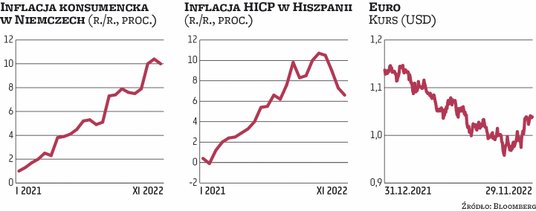 Inflacja konsumencka w Niemczech wyhamowała do 10 proc. w listopadzie z 10,4 proc. w październiku. Średnio prognozowano, że pozostanie ona na takim samym poziomie. Licząc miesiąc do miesiąca, ceny spadły aż o 0,5 proc. Niemiecka inflacja HICP, czyli liczona według ujednoliconego koszyka Eurostatu, wyniosła natomiast 11,3 proc., po tym jak w październiku doszła do 11,6 proc. W porównaniu z zeszłym miesiącem wzrost cen wyhamował z 1,1 do 0 proc. Inflacja w największej gospodarce strefy euro mogła już więc osiągnąć swój szczyt w październiku. Podobne sygnały, świadczące o słabnącej presji inflacyjnej, zaczynają napływać również z innych państw Eurolandu.
