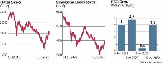 „Koszty ekonomiczne dynamicznej polityki zerocovidowej rosły, gdyż każdy nowy wariant wirusa rozprzestrzeniał się szybciej. Wcześniej ocenialiśmy, że poziom restrykcji pandemicznych dominujący w ostatnich miesiącach kosztował Chiny 4–5 proc. PKB w utraconej aktywności gospodarczej. To ponad pół biliona dolarów rocznie” – piszą analitycy Goldman Sachs. Lockdowny skłaniały też część zagranicznych koncernów do rozważania relokacji produkcji z Chin. (Według „The Wall Street Journal” plany relokacji chce przyspieszyć koncern Apple, tak by produkować 40–50 proc. swoich smartfonów w Indiach). Na to nakładały się skutki wciąż niezakończonej wojny handlowej z USA i ogólnego osłabienia światowego popytu na chińskie dobra eksportowe. Wskaźnik CNBC Supply Chain Map pokazywał na początku grudnia spadek zamówień z USA składanych w chińskich fabrykach aż o 40 proc. Dane firmy badawczej Project44 mówią natomiast, że przewozy kontenerowe z Chin do USA spadły od sierpnia do końca listopada o 21 proc. Załamanie popytu na chińskie produkty jest więc spore.