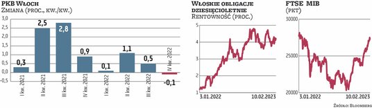 Również sytuacja rynkowa jest w przypadku Włoch zadziwiająco dobra. FTSE MIB, główny indeks giełdy w Mediolanie, zyskał od początku roku 16 proc. i znalazł się w tym okresie w gronie dziesięciu najlepszych indeksów giełdowych świata. Od dołka z jesieni wzrósł on już o 33 proc. Wszedł więc w rynek „byka”. Do historycznego rekordu z 2007 r. wciąż mu bardzo daleko – około 40 proc. – ale zbliżył się on do szczytu ze stycznia 2022 r. Sytuację gospodarczą Włoch trudno natomiast ocenić jako dobrą, ale jest dużo lepsza, niż się obawiano jeszcze kilka miesięcy temu. Może się nawet okazać, że Włochy będą miały w tym roku wyższy wzrost gospodarczy niż Niemcy. Zresztą prześcignęły one RFN pod tym względem w 2021 r. i najprawdopodobniej również w 2022 r.