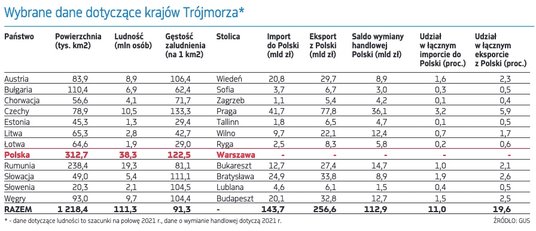 Analizując znaczenie Trójmorza dla UE, trzeba mieć z kolei na uwadze, że jego powierzchnia to niespełna 29 proc. powierzchni Wspólnoty i około 25 proc. jej populacji. Ponadto łączny PKB państw Trójmorza to nieco ponad 2 bln euro (w cenach bieżących w 2021 r.) wobec 14,5 bln euro całej UE. Tym samym jego udział w PKB Wspólnoty to zaledwie 13,8 proc. Większy mają Niemcy (3,6 bln euro) i Francja (2,5 bln euro).