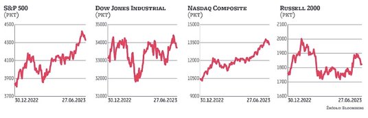 Ożywienie na amerykańskim rynku akcji koncentrowało się jak dotąd głównie wokół firm technologicznych. Po marcowym kryzysie bankowym duże spółki z sektora nowych technologii były traktowane przez inwestorów jako „bezpieczne przystanie”. Zwyżki przedłużyły się na II kwartał, do czego przyczyniły się nadzieje związane z technologią sztucznej inteligencji oraz oczekiwania na to, że Fed wkrótce zakończy cykl podwyżek stóp procentowych. Nasdaq Composite zyskał więc od początku roku aż 27 proc., podczas gdy Dow Jones Industrial wzrósł tylko o prawie 2 proc., a indeks małych spółek Russell 2000, zyskał ponad 4 proc.