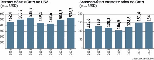 Gdy administracja Joe Bidena obejmowała rządy, zapowiadała odejście od wielu aspektów polityki Trumpa. Wielu analityków zastanawiało się wówczas, jak mocno zmiany te obejmą politykę handlową. Czy dojdzie choćby do obniżki karnych ceł nałożonych na chińskie produkty przez poprzednią administrację? Od tamtej pory w stawkach celnych na dobra z Chin doszło jedynie do kosmetycznych zmian. Z grubsza cła pozostały takie same. Według wyliczeń Instytutu Gospodarki Światowej im. Petersona (PIIE) w styczniu 2018 r. średnie amerykańskie cło na chińskie produkty wynosiło 3,1 proc. Później administracja Trumpa je stopniowo podnosiła, aż do poziomu 21 proc. we wrześniu 2019 r. W 2020 r., w ramach umowy handlowej tzw. pierwszej fazy, spadło ono do 19,3 proc. I na takim poziomie pozostaje do dzisiaj. Średnie chińskie cło na amerykańskie produkty wzrosło natomiast z 8 proc. w styczniu 2018 r., do 21,8 proc. we wrześniu 2019 r. Po umowie handlowej pierwszej fazy spadło do 21,3 proc. Później było dwukrotnie obniżane o 0,1 pkt proc. – za pierwszym razem w lipcu 2020 r., za drugim w maju 2022 r. wynosi więc obecnie 21,1 proc. Amerykańskimi cłami jest objęte 66,4 proc. towarów sprowadzanych z Chin, a chińskimi 58,3 proc. dóbr importowanych z USA. Nic się pod tym względem nie zmieniło od września 2019 r.