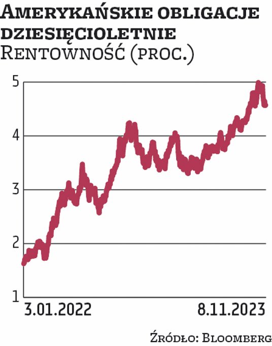 Wzrost kosztów obsługi amerykańskiego długu publicznego to skutek tego, że rentowności obligacji emitowanych przez rząd USA mocno się zwiększyły przez ostatnich kilkanaście miesięcy. Jeszcze 19 miesięcy temu annualizowane odsetki od amerykańskiego długu wynosiły około 500 mld USD. O ile w lutym 2022 r., przed rozpoczęciem podwyżek stóp procentowych przez Fed, rentowność amerykańskich obligacji dziesięcioletnich wynosiła około 1,8 proc., o tyle w październiku 2023 r. przekroczyła ona 5 proc. W środę po południu wynosiła 4,59 proc., a jej spadek w ostatnich tygodniach spowodowany był tym, że inwestorzy zaczęli oczekiwać, że Fed nie podniesie stóp procentowych na swoim grudniowym posiedzeniu. Analitycy wskazują jednak, że koszty obsługi długu powinny wciąż rosnąć w nadchodzących miesiącach, choćby ze względu na planowane jego duże emisje.
