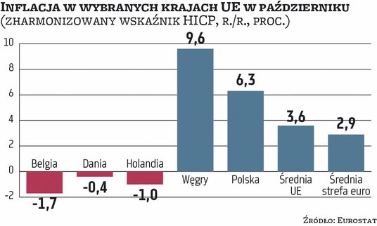 W UE w październiku nie było już kraju, który w ujęciu rocznym notowałby inflację dwucyfrową. Węgry, które we wrześniu miały 12,2 proc. inflacji HICP, w październiku nadal nękał najsilniejszy wzrost cen spośród wszystkich krajów unijnych, jednak tempo tego wzrostu spadło do 9,6 proc. Tuż za nimi uplasowały się Czechy, w których wskaźnik wzrostu cen podskoczył w zeszłym miesiącu do 9,5 proc. z wrześniowych 8,3 proc. Z wysokim tempem wzrostu cen zmagają się nadal Rumuni (8,3 proc., spadek z 9,2 proc. we wrześniu), Słowacy (7,8 proc., spadek z 9 proc.), Chorwaci (6,7 proc., spadek z 7,4 proc.), Słoweńcy (6,6 proc., spadek z 7,1 proc.), Polacy (6,3 proc., spadek z 7,7 proc.) i Bułgarzy (5,9 proc., spadek z 6,4 proc.).