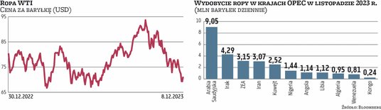 Temu dużemu popytowi towarzyszą ograniczenia podaży surowca. Część państw OPEC+ na niedawnym posiedzeniu ministrów tego kartelu zdecydowała się na dobrowolne cięcia produkcji ropy w I kwartale 2024 r. wynoszące łącznie 2,2 mln baryłek dziennie. Wśród nich jest Arabia Saudyjska, która przedłuży o trzy miesiące cięcia wynoszące 1 mln baryłek dziennie. W listopadzie wydobywała ona 9,05 mln baryłek dziennie, podczas gdy jej moce produkcyjne wynoszą 12 mln baryłek dziennie. Produkcja w całym OPEC sięgała natomiast w zeszłym miesiącu 28,05 mln baryłek dziennie, podczas gdy zdolności produkcyjne sięgały 34,16 mln baryłek dziennie. Globalną podaż zaniżano więc o ponad 6 mln baryłek dziennie, czyli o więcej, niż łącznie produkują Iran i Kuwejt. Mimo to cena ropy gatunku WTI spadła w pierwszym tygodniu grudnia poniżej 70 dol. za baryłkę. Była ona najniższa od końcówki czerwca i o 13 proc. mniejsza niż na początku roku. Zniżkowała, choć przecież wojna między Izraelem a Hamasem nadal rozgrzewa nastroje na Bliskim Wschodzie. Co się więc takiego się stało, że pomimo cięć wydobycia w krajach OPEC+ i napięć geopolitycznych nie wystrzeliła ona w górę?