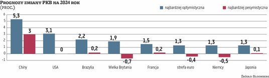Jedną z największych pozytywnych niespodzianek 2023 r. było to, że USA nie wpadły w recesję. Ich gospodarka okazała się wręcz zadziwiająco odporna na podwyżki stóp procentowych. Czy będzie równie silna również w 2024 r. będącym rokiem amerykańskich wyborów prezydenckich? MFW spodziewa się, że wzrost PKB USA wyhamuje z 2,1 proc. w 2023 r. do 1,5 proc. w 2024 r. Przedział prognoz zebranych przez agencję Bloomberg jest natomiast bardzo duży. Największymi pesymistatmi są analitycy MetLife Investment, którzy spodziewają się zerowego wzrostu. Najbardziej optymistycznie nastawieni są natomiast eksperci z firmy EconForecaster (3,1 proc.). Mediana prognoz wskazuje na wzrost wynoszący 1,3 proc., a na jego kolejne kwartały: 2,2 proc., 1,7 proc., 0,7 proc. i 0,8 proc. (To prognozy annualizowane, czyli liczone kw./kw. w tempie rocznym). Prawdopodobieństwo recesji wynosi, według Bloomberga, 50 proc.