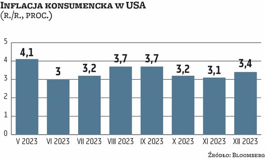 Inflacja konsumencka w USA przyspieszyła z 3,1 proc. w listopadzie do 3,4 proc. w grudniu, a oczekiwano jej wzrostu tylko do 3,2 proc. Licząc miesiąc do miesiąca, ceny wzrosły o 0,3 proc. po listopadowej zwyżce o 0,1 proc. Inflacja bazowa (czyli nieuwzględniająca zmian cen żywności, paliw i energii) wyhamowała z 4 proc. do 3,9 proc., a spodziewano się, że wyniesie 3,8 proc. W ujęciu miesięcznym wyniosła ona 0,3 proc., czyli tyle samo co w listopadzie.