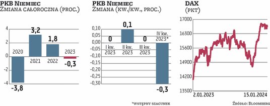 Zebrane przez agencję Bloomberga prognozy analityków dla niemieckiego PKB na pierwszy kwartał 2024 r. są w przedziale od minus 0,4 proc. do plus 0,3 proc. Przedział projekcji na drugi kwartał sięga od 0 proc. do wzrostu o 0,6 proc. Prognozy dla PKB na cały 2024 r. wahają się natomiast od spadku o 0,5 proc. (Citigroup) do wzrostu o 1,3 proc. (Helaba), a ich mediana wynosi 0,3 proc. Wśród analityków wyraźnie więc przeważa przekonanie, że Niemcy nie będą w tym roku lokomotywą wzrostu w strefie euro.