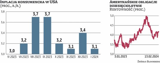 Amerykańska inflacja konsumencka wyhamowała z 3,4 proc. w grudniu do 3,1 proc. w styczniu, ale analitycy średnio prognozowali, że zejdzie ona do 2,9 proc. Sporym rozczarowaniem okazała się inflacja bazowa (czyli liczona bez uwzględniania cen energii, paliw i żywności). Pozostała ona na poziomie 3,9 proc., podczas gdy średnio oczekiwano, że wyniesie 3,7 proc. Licząc miesiąc do miesiąca, inflacja bazowa przyspieszyła nawet z 0,3 proc. do 0,4 proc.