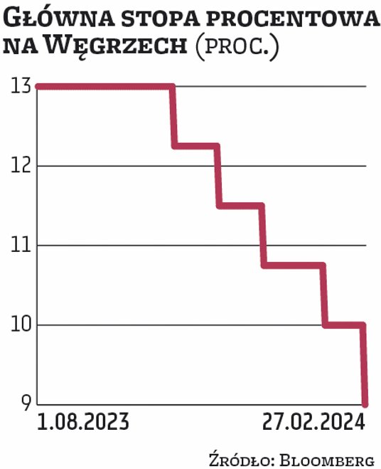 Wtorkowa obniżka stóp była już piątą z rzędu. Węgierski bank centralny luzuje więc politykę mocniej, niż dotąd robiły to banki centralne w Czechach i w Polsce. Zaczął on jednak cięcia z bardzo wysokiego poziomu. W październiku, tuż przed rozpoczęciem cyklu luzowania polityki pieniężnej, główna stopa procentowa wynosiła 13 proc. Pierwsze cztery cięcia były po 75 pkt baz. Bank centralny pozwolił sobie na wtorkowym posiedzeniu na większą obniżkę, gdyż inflacja wyraźnie wyhamowała. Zeszła ona z 5,5 proc. w grudniu do 3,8 proc. w styczniu (średnio prognozowano, że wyniesie ona 4,4 proc.). Jeszcze rok temu – w lutym 2023 r. – wynosiła ona aż 25,4 proc. i była najwyższa w Unii Europejskiej.