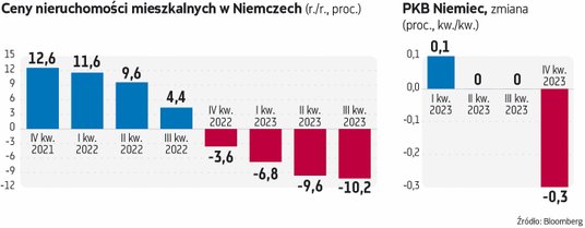 Na rynku mieszkaniowym w RFN trwa przecena. W trzecim kwartale 2023 r. ceny nieruchomości mieszkalnych spadły tam o 10,2 proc. Był to ich największy spadek od 2000 r. i piąty z rzędu kwartał przeceny. – Możemy się spodziewać dalszych spadków wartości. Oczekuję, że ceny spadną o 20 proc. w stosunku do szczytu z 2022 r. Trzeba się jednak przygotować na to, że nie będzie to 20 proc., tylko 25 lub 30 proc. Twój bilans musi to wytrzymać – stwierdził w rozmowie z agencją Reuters Martin Thiel, prezes firmy TAG Immobilen oferującej mieszkania na wynajem.
