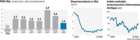 A co mówią wskaźniki nastrojów konsumenckich? Ich indeks, mierzony przez Uniwersytet Michigan, lekko spadł w kwietniu do 77,9 pkt, po tym jak w marcu osiągnął najwyższy poziom od lipca 2021 r. Za rządów Joe Bidena najwyżej był on w kwietniu 2021 r., na poziomie 88,3 pkt. Za rządów Trumpa maksymalnie on doszedł natomiast do 101,4 pkt w 2018 r. Wiosną 2020 r., w czasie pandemii, spadł on do 71,8 pkt, ale za rządów Bidena zszedł jeszcze niżej – do 50 pkt w czerwcu 2022 r. Indeks optymizmu ekonomicznego RealClearMarkets/TIPP spadł natomiast w kwietniu 2024 r. do 43,2 pkt. Dno osiągnął w październiku 2023 r. na poziomie 36,3 pkt. Za rządów Trumpa był on najniżej w lipcu 2020 r. (44 pkt), a najwyżej w lutym 2020 r. (59,8 pkt).