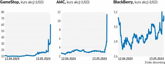 Akcje GameStop i AMC zyskiwały na początku wtorkowej sesji odpowiednio po 98 proc. i 108 proc. W poniedziałek papiery GameStop rosły o 110 proc., a zamknęły się 74 proc. na plusie. Akcje AMC zyskały natomiast podczas poniedziałkowej sesji ponad 78 proc. Na rynek wróciła więc spekulacja papierami tych dwóch firm zaliczanych do grona spółek memicznych. Impulsem do tych zwyżek był powrót do mediów społecznościowych Keitha Gilla, youtubera znanego pod pseudonimem Roaring Kitty i zarazem analityka rynkowego, który na początku 2021 r. zainicjował akcję masowego kupowania papierów spółek memicznych przez drobnych inwestorów związanych z forum WallStreetBets na portalu Redditt.